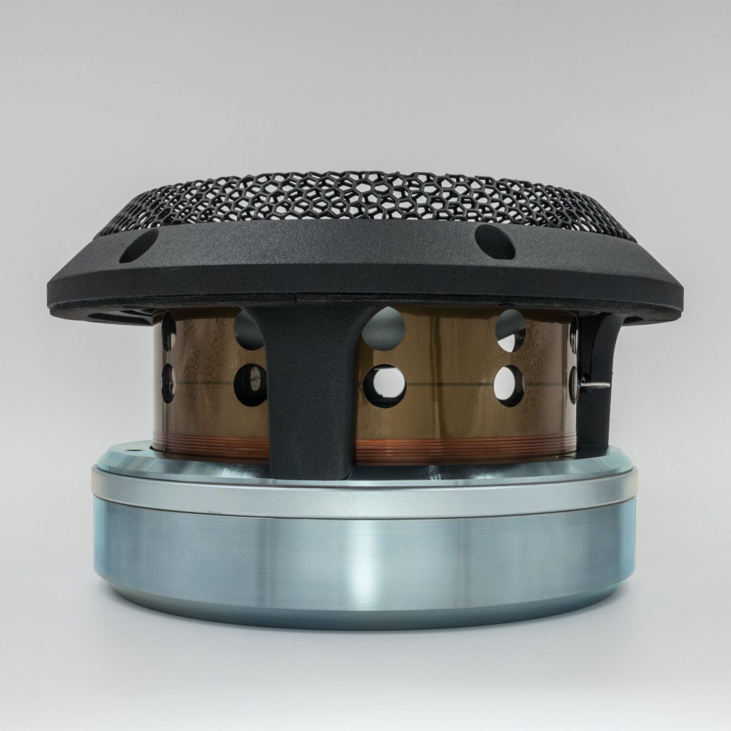 Ein Magnetsystem mit Neodym-Magneten treibt den Lautsprecher an. Der Lautsprecher hat eine Metallfrontplatte mit 3 mm Stärke.