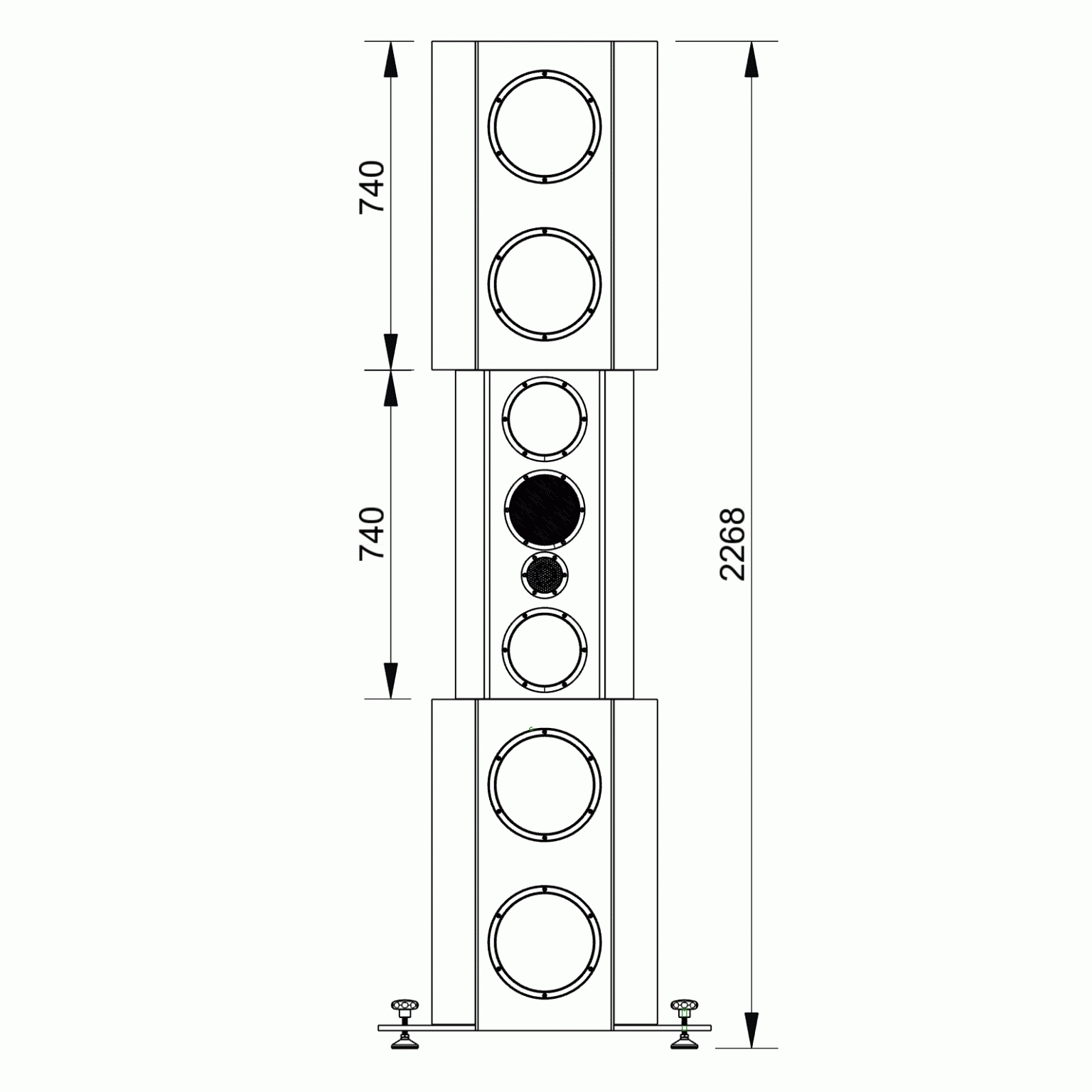 Der Lautsprecher wird ca. 227 cm Höhe erreichen. Die Module sind 740 mm hoch und können in Zukunft auf Kundenwunsch in der Bestückung angepasst werden. Wir haben schon verschieden Wünsche gehört und können auf unterschiedliche Bedürfnisse und Wünsche reagieren.